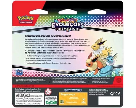 Eevee e suas adoradas evoluções conquistaram os corações dos treinadores desde a região de Kanto, e agora é a sua vez de adicionar essa lenda à sua coleção. Com uma carta holográfica promocional exclusiva, você estará pronto para brilhar em qualquer batalha! Mas não para por aí – este conjunto vem com 4 pacotes de booster da expansão Escarlate e Violeta – Evoluções Prismáticas, repletos de cartas incríveis para expandir suas estratégias e enriquecer sua coleção. Quais surpresas você encontrará? Só há uma maneira de descobrir!